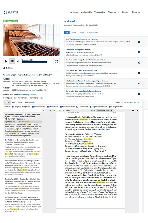Mit einem Abonnement erhalten Sie die Zeitschrift «Geistige Welt» sechsmal pro Jahr frei Haus zugestellt. Zusätzlich haben Sie Zugang zu unserem Online-Portal. Dieses beinhaltet den Livestream zur Direktübertragung der Gottesdienste aus dem Saal der GL Zürich sowie ein Video- und Audioarchiv mit jederzeit abrufbaren Vorträgen, Erlebnisberichten und Meditationen. Zudem können Sie in über 40 Büchern der GL Zürich online lesen, und es steht Ihnen eine Stichwortsuche zur Verfügung, die Ihnen eine uneingeschränkte Suche nach bestimmten Begriffen in unserer Literatur erlaubt.